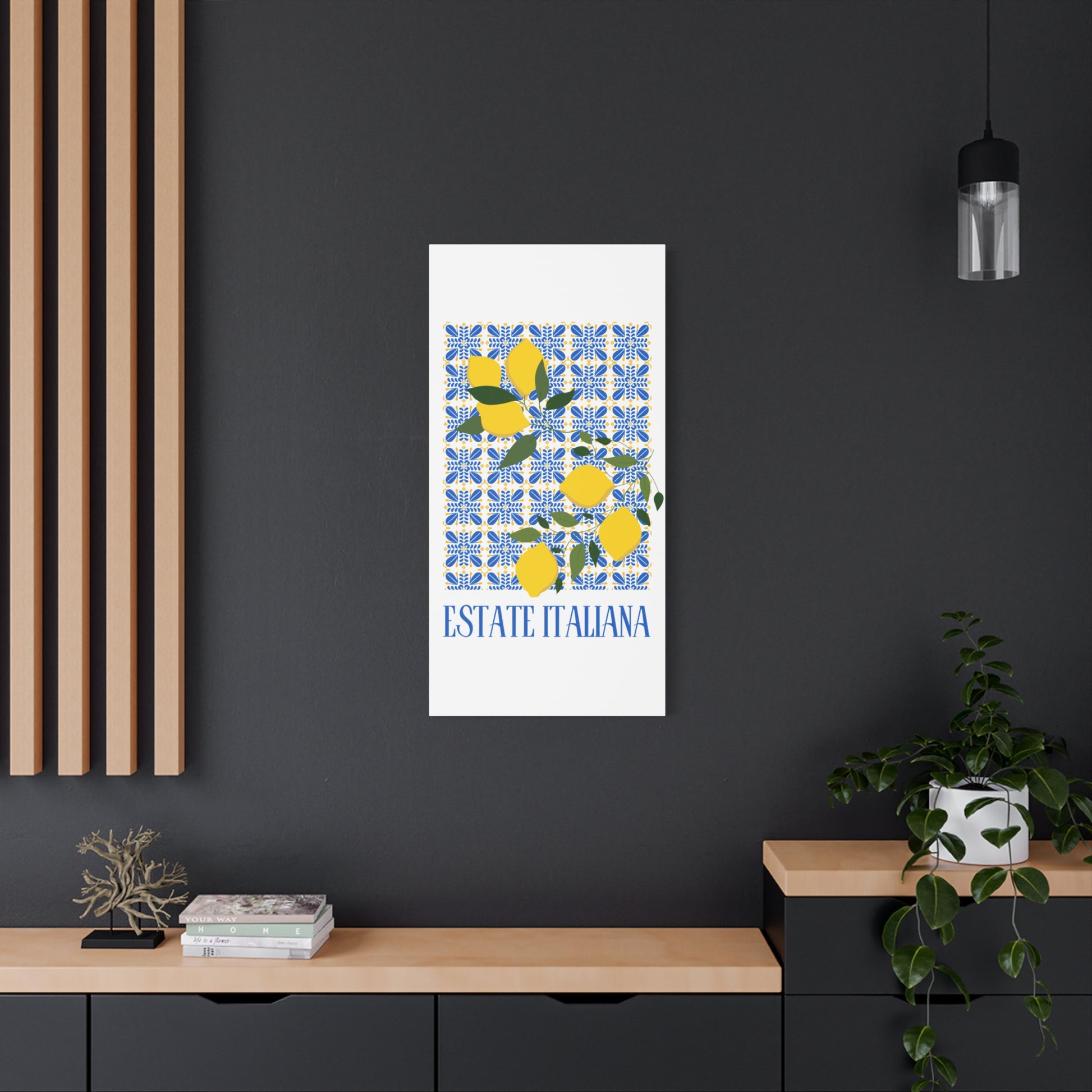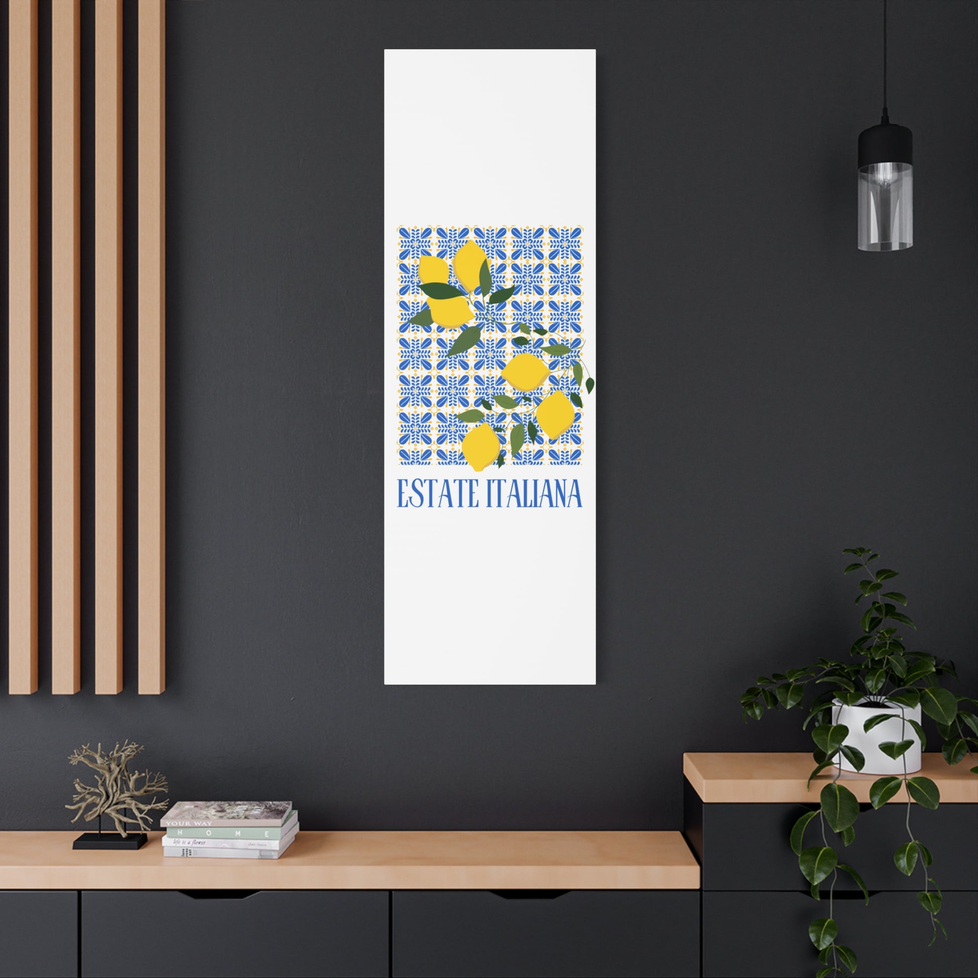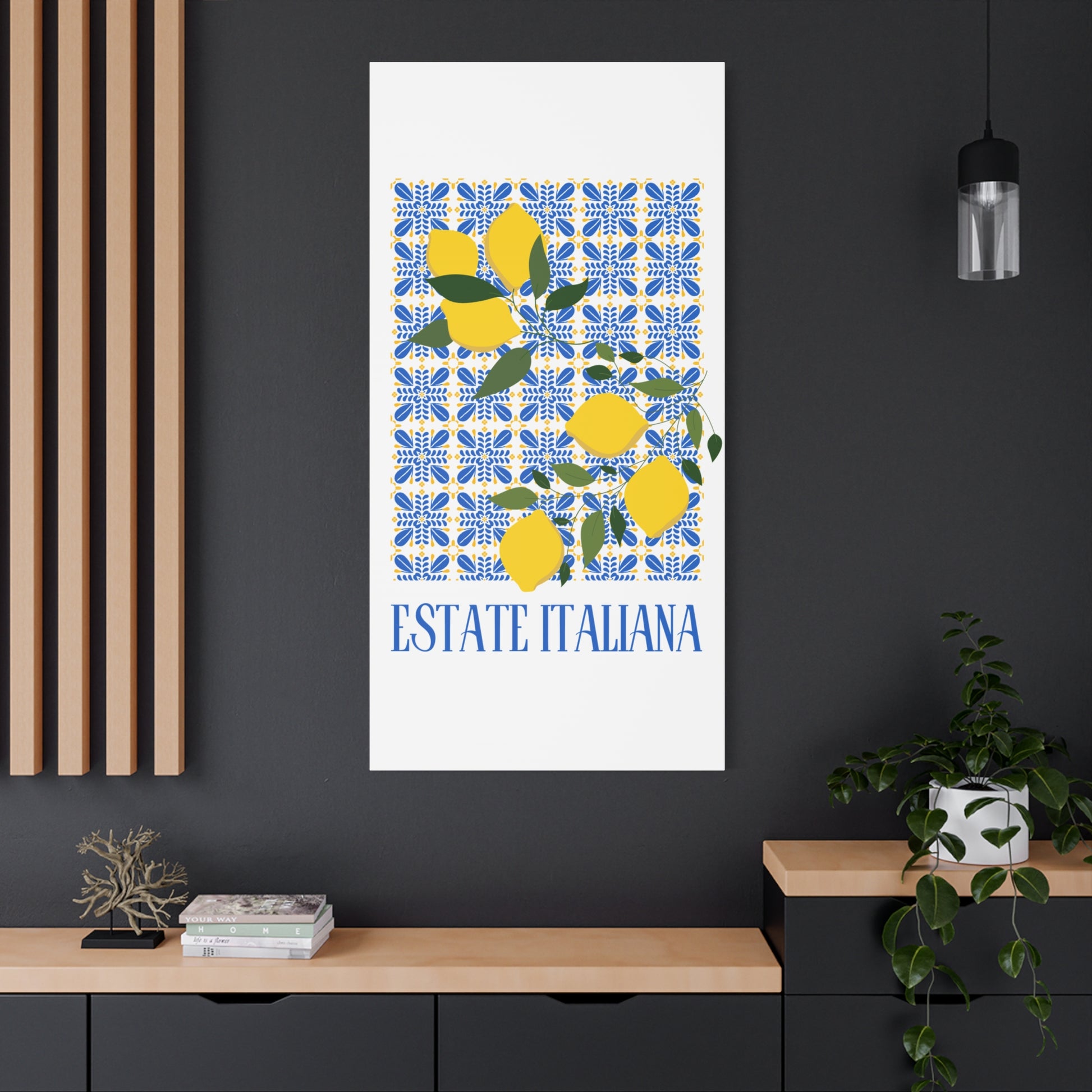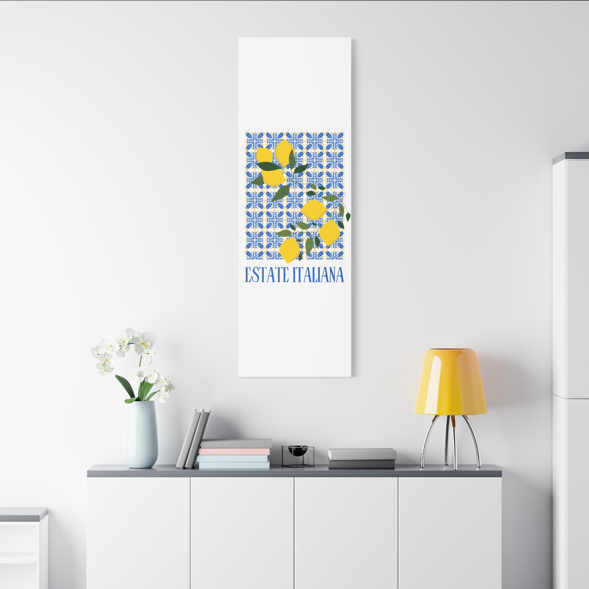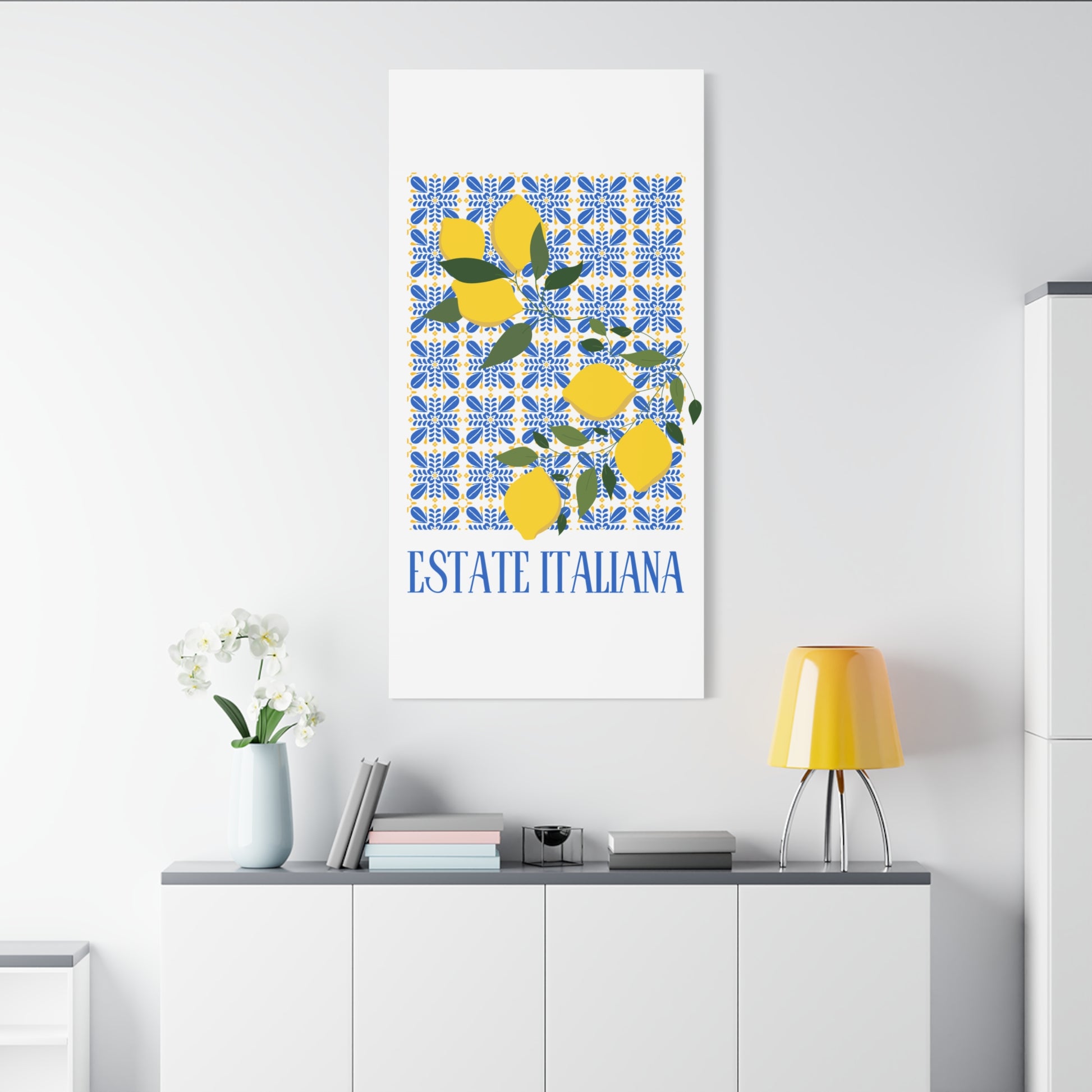Estate Italiana – Italienischer Sommer – Leinwanddruck – mit dekorativen Zitronen und Majolika-Fliesen – Dekorative Wanddekoration