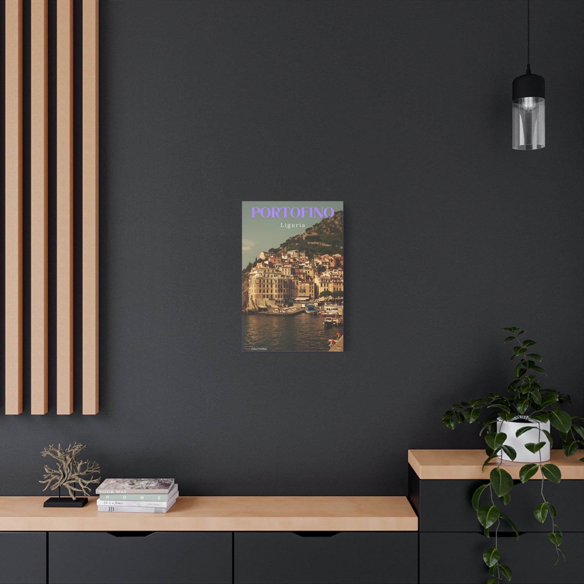 Erleben Sie die elegante Sommeratmosphäre des atemberaubenden Portofino an der italienischen Riviera. Der runde Hafen wirkt wie eine Postkartenidylle: farbenfrohe Gebäude, Restaurants am Wasser, kristallklares Wasser, Fischerboote, luxuriöse Yachten und perfekt platzierte Zypressen auf den grünen Klippen im Hintergrund. Ein traumhafter Ort für die Reichen und Schönen – und für alle, die sich auch nur für einen Nachmittag so fühlen möchten. Dieses Kunstwerk ist sorgfältig auf hochwertigem Baumwollmischgewebe gedruckt und auf einen stabilen Rahmen aus neuseeländischem Kiefernholz gespannt. Es ist leicht und einfach aufzuhängen; dank des mitgelieferten Selbstmontage-Sets verleiht es Küche, Essecke oder Eingangsbereich im Handumdrehen eine frische, luftige und warme Note. Jeder Blick auf dieses Bild erinnert an eine Postkarte aus einem Sommerurlaub. Die seidenmatte Oberfläche bringt die Farben optimal zur Geltung und sorgt für eine edle, galerietaugliche Optik. Wählen Sie aus verschiedenen Größen und Ausrichtungen, um eine Wand zu akzentuieren oder eine Bildergalerie zu ergänzen.